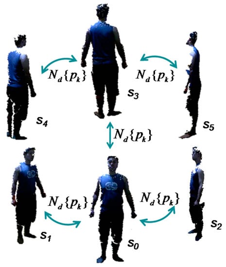 When all the partial views finish searching and paring the correspondence points on the silhouette, the neighboring views can be aligned by pairwise correspondence based on the closest Euclidean distance. The pre-alignment procedure for all 6 views is repeated 5 times, as shown in Figure 8. In theory, pre-alignment can be conducted iteratively in turn, such as by clockwise order. However, the scanned body has more exposure to the sensor on the front and back sides; thus, the captured frames on these two sides have more data points, which may offer more overlap between neighboring views. This can help to improve the quality of alignment and obtain more accurate results. Therefore, pre-alignment is first conducted for the front and back views with the side views, namely, s0 and s1, s0 and s2, s3 and s4, s3 and s5, and finally s0 and s3. In the reference, similarly, Wang et al. [34] had used the contours coherence to align two wide baseline range scans with limited overlap.