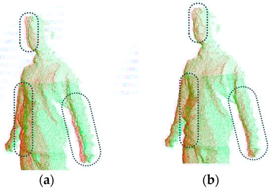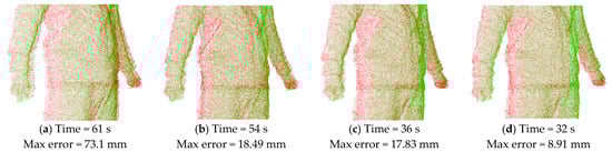 To demonstrate alignment performance using the normal shooting and point-to-tangent plane methods in correspondence computation in the above, we compare the results of non-rigid alignment on the same input of two point clouds in neighboring views (as shown in Figure 11) when adopting various combinations of methods in correspondence pairing computation. As shown in Figure 12, the results from the point-to-tangent plane (PTTP) method indicated in Figure 12c,d have better non-rigid alignment quality which have smaller maximum error of Euler distance between two aligned frames and much faster speed than those based on the point-to-point (PTP) method indicated in Figure 12a,b. Thus, the point-to-tangent plane method works well for no-rigid alignment. Meanwhile, a comparison of the results of Figure 12a–d for closest Euclidean distance (CED) and normal shooting (NS) methods in correspondence point searching shows that the normal shooting (NS) method can improve both alignment efficiency and quality. However, in local rigid alignment, it is observed that the NS method contributes to inferior alignment performance. This phenomenon is due to the fact that the NS method requires more time in correspondence point searching and may obtain fewer points but better accuracy than the CED method. The number of correspondence points influences the subsequent steps in non-rigid alignment and may lead to remarkable differences in the total performance of alignment, which is more significant than the difference in correspondence point searching. However, the number of correspondence points has little influence on subsequent steps in local rigid alignment, the final performance of which is mainly affected by the time involved in correspondence point searching. Meanwhile, the point clouds have been down-sampled before the non-rigid alignment step, and the number of data points is greatly reduced, while the point clouds are much denser in the local rigid alignment. These facts cause the difference in performance of the NS and CED methods in local rigid alignment and global non-rigid alignment, respectively.