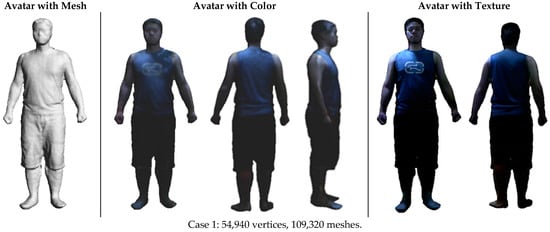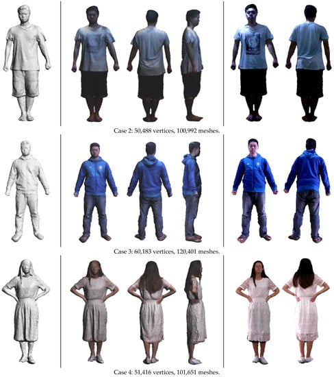 Although there are a variety of human scanning scenarios with different specifications, we choose five cases that represent classic scenarios in practice, including a male subject wearing tight clothing (Case 1), loose clothing (Case 2) and winter clothing (Case 3), as well as a female subject wearing a piece of floppy skirt (Case 4). These cases involve possible relative body motion and deformation at different levels. The cases of a male subject wearing loose and winter clothing have more deformation than the cases of a male subject wearing tight clothing. The case of the female subject is the most challenging because she not only wears a piece of floppy skirt, which deforms easily and swings, but she also has fluttering long hair. In addition, she is posed with arms akimbo, which could cause self-occlusion during scanning. Following the reported reconstruction pipeline, the 3D avatar models in these cases are reconstructed in a user-friendly and efficient way. Figure 13 shows the reconstruction results, which include reconstructed avatar with mesh, avatar with color and avatar with texture. It can be seen that our method can achieve desirable results of 3D avatars, with realistic clothing wrinkles and deformation as well as realistic hairstyles in the case of the female subject. Compared to the current methods based on laser scanning or infrared scanning, the Kinect scanning method is quite flexible and able to conveniently obtain the virtual avatars of users with low cost.