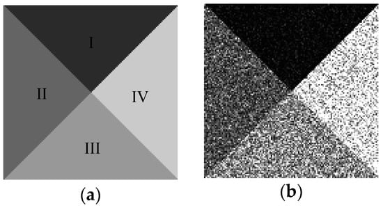 Figure 1a is a template with size of 128 × 128 pixels for generating a simulated SAR image which covers four homogeneous regions labeled I-IV, respectively. Figure 1b is the simulated image, in which the intensities of pixels in each homogeneous region are drawn from a Gamma distribution with the shape and scale parameters listed in Table 1.