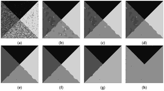 Segmentation process images in iterations. (a) Initial, m = 9; (b) τ = 1, m = 8; (c) τ = 2, m = 7; (d) τ = 3, m = 6; (e) τ = 4, m = 5; (f) τ = 5, m = 4; (g) τ = 6, m = 3; (h) τ = 7, m = 2.