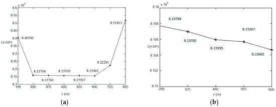 In order to generate initial segmentation of image shown in Figure 1b, we set span parameter d = 30. Then the initial number of clusters m is ⌈255/30⌉ which is equal to 9. In this experiment, α = 4 as the looks of SAR image. The coefficient η, which expresses the influence of neighbor pixels, is always taken from 0 to 1. If η is too small, the results will exist many misclassification pixels although the number of clusters is correct, contrarily, it will be over segmented. According to experiments, η = 0.8 which is suitable for the simulated images. Figure 2a is the initial segmentation with m = 9. Figure 2b–h show the corresponding segmentation results with the gradually decreased number of clusters during outer loop. It shows that the initial segmentation in gray level already can roughly distinguish each homogeneous regions shown in Figure 2a. With the increase of the iteration, the number of clusters reduce one each time, and the optimal segmentation can be obtained under the condition of each number of clusters shown in Figure 2b–h. For the homogeneous region with smaller scale parameters like region I, it is easy to be segmented, and the heavily interwoven regions like regions II and III must be divided by iterations with the help of MRF. In the iterations, the global energy value L and the number of clusters m with iteration τ are shown in Figure 3. Figure 3a,b are the full view and local amplification image. It can be seen that the minimum global energy function value is 8.15465 × 104 corresponding to the iteration 6, and the corresponding number of clusters is 4. Thus, the final optimal segmentation result is the one shown in Figure 2f.