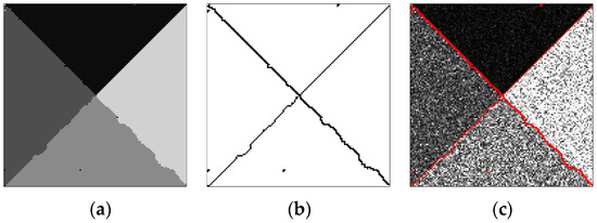 The final optimal segmentation results by the proposed algorithm are displayed in Figure 4. Figure 4a is the final optimal segmentation, Figure 4b is the outline of the homogeneous regions, and Figure 4c shows the result of outlines overlaid on the original image.