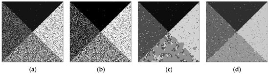 Figure 8 shows the real SAR images with size of 128 × 128 pixel and the real number of clusters are 2, 3, 3 and 4, respectively. Figure 8a is a RADARSAT-I intensity image with HH polarization and the spatial resolution of 30 m, Figure 8b,c are RADARSAT-II images with VV polarization and the spatial resolution of 25 m, Figure 8d is a RADARSAT-I image with HH polarization and the spatial resolution of 25 m. All of them are sea ice images in different periods, from light to dark, representing sea ice with density from high to low. The image in Figure 8a with two clusters is easy to segment for all algorithms. For the images in Figure 8b,c with three clusters, it is difficult to segment the different types of sea ices. For the image in Figure 8d with four clusters, the difficulty is that the water is easy to ignore because its area is too small compared with the background of low density sea ice areas.