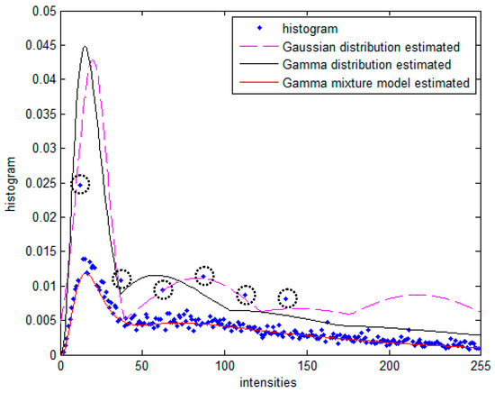 In order to demonstrate the superiority of GaMM, the histogram for simulated image and the estimated curve with Gaussian distribution, Gamma distribution and GaMM, respectively, are shown in Figure 6. From Figure 6, one can see that the GaMM with different weights can fit the histogram of the image more accurately.