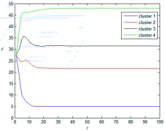 In order to prove that T = 20 is the optimal result, the change of scale parameter β with iteration is shown in Figure 7. From Figure 7 one can see that scale parameter β for each cluster converges to its stable value after 20 iterations. Consequently, 20 is regard as T’s optimal choice, because it not only ensures the accuracy of segmentation but also saves time. Furthermore, the sensitivity of the value of T is also analyzed through the segmentation accuracy with different T under d = 30, η = 0.8, the results are listed in Table 5. If the value of T is too small, the segmentation result is inaccurate, if the value of T is too large, the running time will be increased.