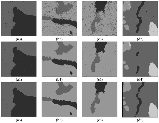 Figure 9 is the segmentation results with the proposed algorithm and the comparing algorithms of ISODATA, AGNES, HMRF-FCM and Gamma-MRF. Figure 9(a1–d1) are the results of the ISODATA algorithm, Figure 9(a2–d2) are the results of the AGNES algorithm, Figure 9(a3–d3) are the results of the HMRF-FCM algorithm, Figure 9(a4–d4) are the results of the Gamma-MRF algorithm and Figure 9(a5–d5) are the results of the proposed algorithm.