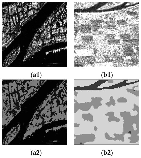 In addition, segmentation experiments for SAR images covering urban and agricultural areas were also carried out. Figure 11(a1,b1) show the HH RADARSAT-I/II intensity images for an urban area with two looks and an agricultural area with three looks, respectively. The scene shown in Figure 11(a1) contains three objects, including water, streets and buildings, and the scene in Figure 11(b1) contains water and two kinds of farmland. Figure 11(a2,b2) are the corresponding segmentation results from the proposed algorithm with d = 20, η = 0.3, α = 2 and d = 20, η = 0.35, α = 3, respectively. One can see that the proposed algorithm can separate the street from water on the basis of segmenting buildings and effectively distinguish different kinds of farmland. The water and streets shown in Figure 11(a2) are not clearly displayed, just because their grayscales are similar. Figure 11 illustrates that the proposed algorithm can segment not only simple SAR images well, but also complex images with different noise levels.