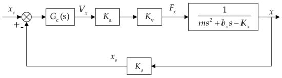 Equation (3) also shows that the electrostatic bearing can be modeled as a mechanical mass-spring-damper system. The levitated rotor is modeled as a mass mechanically attached to a rigid frame through an electrical spring and an air-film damper, despite the absence of a physical spring connecting the rotor to the substrate. By inspecting the characteristic equation of the transfer function in Equation (3), open-loop instability due to the negative position stiffness, i.e., −Kx, can be found as there is a pole on the right-hand side of the s-plane. Consequently, active feedback control must be utilized to stabilize the suspension servo. A simplified block diagram of the closed-loop bearing control loop is shown in Figure 2, where Ks, Ka, and Gc(s) are the sensitivity of the rotor position sensor, gain of the voltage amplifier, and transfer function of the feedback controller, respectively.
