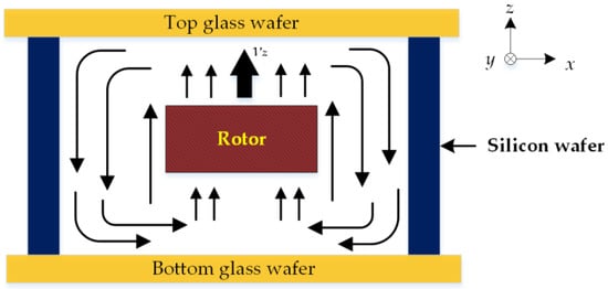 The triple-layer bonded cavity used in modeling the squeeze-film air damping consists of the top and bottom glass wafers, and middle silicon layer, as depicted in Figure 1a. When the suspended rotor moves upward with a velocity νz, the resistive force to the rotor moving normally against the top/bottom glass wafers is caused by the viscous flow of air between the rotor and surrounded stator. A cross-sectional view of the air flow is shown in Figure 3.