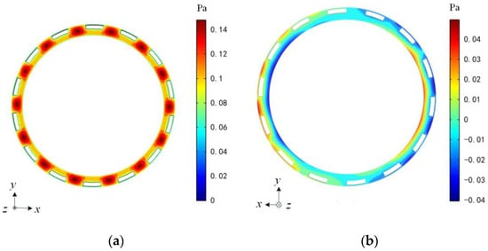 The pressure distribution caused by the movement of the rotor along the z-axis is shown in Figure 4a. Clearly, the maximum pressure distributes uniformly along 14 outmost slots. Using Equation (9), the coefficient of the damping acted on the annular rotor by a 6 μm squeezed air film thickness is 2.41 × 10−2 N/(m·s−1). It seems that the inclusion of these motor slots in the rotor greatly reduces the squeeze-film damping coefficients of the axial motion, as described in such perforated MEMS structures [].
