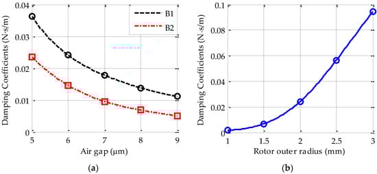 The simulated z-axis damping coefficient (a) damping coefficient varying with the axial gap for the sealed (B1) and the unsealed (B2) devices; (b) damping coefficient varying with the rotor outer radius for the sealed device.
