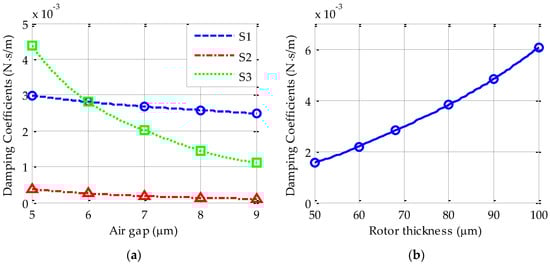The simulated x-axis damping coefficient (a) damping coefficient varying with the radial (S1, S2) or axial (S3) rotor-stator gap and (b) damping coefficient varying with the thickness of the rotor for the sealed device. Note that the curves S1 and S3 are obtained by assuming a sealed device while the curve S2 is simulated from an unsealed one.