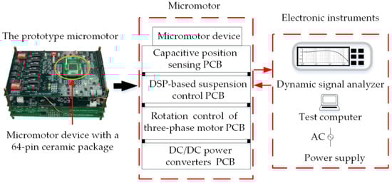 Experimental measurements are needed to validate the numerical models used and to ensure that all necessary physical phenomena are taken into account in the damping characterization. Experimental strategies for the measurement of dynamic parameters of the MEMS dampers have been proposed in different studies []. One of most popular methods is to extract the quality factor of the mass at resonance. In order to validate the above estimated results by FEM simulation, an electrical measurement method is proposed in Section 2.3 to extract the air-film damping coefficients by experimental frequency responses. The experimental setup, as shown in Figure 7, is composed of four stacked printed circuit boards (PCBs) for five-axis capacitive position sensing, digital bearing control, rotation control of the three-phase micro-motor, and DC/DC power converters, respectively. The micromotor device was wired-bonded to 64-pin ceramic chip package and mounted on the top sensing PCB. The electric bearing system is stabilized by three lag compensators for axial suspension of the rotor in the z-, φx-, and φy-axes and two lag-lead compensators for radial suspension in the x- and y-axes, respectively. A typical lag-lead compensator is utilized to illustrate the test procedure
