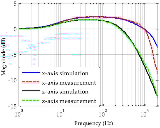 As the closed-loop system can be maintained stably by proper design of feedback controller, it is possible to obtain the damping coefficient experimentally from measured frequency response. Considering all parameters except for bx can be obtained analytically, then we could extract bx by accurately fitting a sweeping-frequency measurement with its simulated frequency response curve. The air-film damping in four other DOFs can be extracted in a similar way by measuring their frequency responses respectively. Using this electrical measurement method, we can verify the simulated results of five-DOF squeeze-film damping by experimental measurements, as detailed procedure description presented in Section 5.