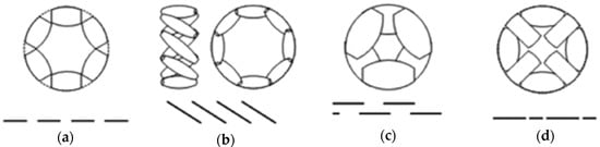 Figure 1 shows different types of omnidirectional wheels and their traces. Figure 1a shows a wheel (universal wheel) designed with multiple passive rollers (or inner passive wheels) where the axes are at a tangent with the main wheel circumference. This construction cannot avoid the existence of discontinuities in the trace; therefore, it provides irregular contact with the surface due to the presence of gaps between the successive rollers producing vibrations in the robot. Some solutions are proposed to minimize those effects in these types of wheels, such as reducing the size of the gap between the passive rollers [10]. Figure 1b shows the Mecanum [11,12], invented in 1973 by Bengt Ilon, an engineer working for the Swedish company Macanum AB. This wheel is based on the use of overlapping rollers providing continuous contact between the wheel and the ground. The design and adjustment of this type of wheel’s parameters allow for a remarkable decrease of the vibrations [13]. These wheels are often positioned in pairs over the same axle but in opposite orientations to a four-wheel structure. The drawback of these wheels is the generation of horizontal vibrations due to the parasite torque generated as a result of the contact points moving along a parallel line to the wheel shaft. Figure 1c shows the double wheel concept based on the use of two overlapping parallel wheels. In this case, the contact between the assembled wheel and the ground is continuous; however, this design still generates a significant horizontal vibration originated by the gaps between the rotating inner wheels [14]. Finally, in the design shown in Figure 1d the contact points are aligned in order to reduce the horizontal vibration while using alternating passive rollers of different sizes and shapes in order to minimize the gap between them, thus causing a slight vertical vibration. As with Macanum wheels, there are jobs where vibrations are analyzed according to the design parameters [15].