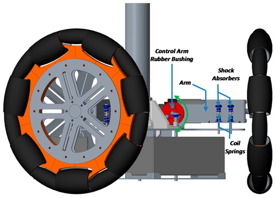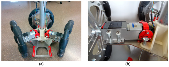Figure 3 shows the structural diagram of the two mobile robot prototypes used in this paper. The chassis in the design of the APR-2 prototype (Figure 3b) improves the wheels and tower joints. The improved joints are based on a damped arm and a joint between the tower and the chassis, allowing the tower to balance and improve its stability as the pivot point is positioned above the tower’s center of gravity. Figure 4 shows the CAD design of the suspension system. Finally, Figure 5 shows an overview of the implemented suspension system (Figure 5a), and a close-up image of a single arm of the base (Figure 5b). The red parts of the APR-2 prototype are made of a flexible 3D printing filament. This prototype also includes two sets of spring-based connections; the first one is located between the motor’s and batteries’ structures; and the second one is found between the mobile robot batteries’ and the central tower’s structures.
