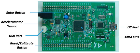 The complete data acquisition system is based on the STM32F4-Discovery board from STMicroelectronics that includes on the same board the LIS3DSH accelerometer sensor and a STM32F407VGT6 32-bit high-performance microcontroller based on the ARM Cortex™-M4 processor developed by ARM (Cambridge, UK), and which is also manufactured by STMicroelectronics (Figure 8). This acquisition system has an USB 2.0 on the go (OTG) interface for connectivity, a reset pushbutton, and a user configurable pushbutton used for data or experiment triggering.