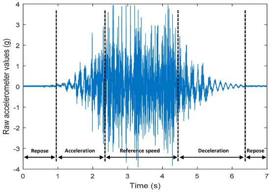 The measurements have been carried out by configuring the accelerometers with a dynamic range of ±4 g and a sensitivity of 0.12 mg/digit. This range has been obtained by a trial and error procedure in order to avoid any saturation in the raw data obtained from the accelerometers. The standard deviations of the sensor for the X, Y, and Z axes at zero speed were 0.0132 g, 0.0181 g, and 0.0144 g, respectively.