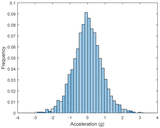 The raw data measured during the displacements has been manually divided in four different states: repose, initial acceleration, constant speed, and deceleration (Figure 10). The data gathered by the accelerometers while the robot is going forward at a constant speed (reference speed) has been selected to create a histogram of the accelerations’ amplitude measured during the displacement. As an example, Figure 11 shows the histogram of the side acceleration measured at the head of APR-1 when moving forward at a reference velocity of 55 cm/s. Figure 11 shows a typical Gaussian distribution with a standard deviation of 0.80 g. The value of the standard deviation will be used in this paper to compare the overall vibrations measured in both mobile robots.