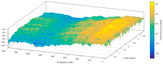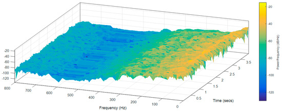 Finally, Figure 12 and Figure 13 show the frequency spectra of the accelerations measured over the longitudinal axis at the head of the two mobile robot prototypes in the case of moving forward at a constant speed of 66 cm/s (Table 9—Longitudinal and Head data). Figure 12 shows that in the case of the APR-1 prototype (without suspension), the highest peak frequencies are in a range from 10 to 300 Hz, while Figure 13 shows that in the case of the APR-2 prototype (with passive suspension), these frequencies have overall smaller amplitudes. These spectra differences go along with the results shown in Table 9 based on the computation of the standard deviation of the vibrations measured in the mobile robots.