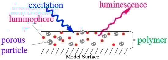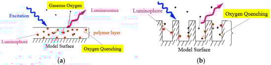 Pressure-sensitive paint (PSP) has been widely utilized in aerospace applications [1,2,3,4,5,6,7,8,9,10]. In combination with a fast frame-rate camera, PSP measurement opens its application to unsteady flow measurement on surfaces and to short duration testing [11,12,13,14,15]. PSP uses a photophysical process of oxygen quenching to relate an oxygen pressure of a testing fluid to a luminescent signal. A luminophore and a supporting matrix that is mixed solvent with a polymer and chemical solvent configure the PSP. The former gives a luminescent signal and the latter holds the luminophore onto a test piece. Oxygen quenching is key for relating the luminescent output to the pressure [16]. The supporting matrix greatly affects the response time of a PSP [17,18]. A conventional PSP uses a polymer as a supporting matrix, which can be sprayed onto any testing model (Figure 1a). To cause oxygen quenching, gaseous oxygen needs to permeate into this layer. Due to the polymer aero-permeability, this type of PSP shows a time response of the order of seconds to sub-seconds. Using a porous material as a supporting matrix enhances the response, as pores or other structures are open to a test gas (Figure 1b). This porous structure provides PSP with a fast response to a pressure change by enhancing mass diffusion in pores. This porous surface structure results in an enhanced time response of this PSP of approximately ten microseconds [18,19,20]. However, this porous PSP is constrained by the supporting matrix [21]. Anodized-aluminum pressure-sensitive paint (AA-PSP), for instance, can only be applied to aluminum models or test pieces [21]. There is a need to combine fast response characteristics with the ability to spray the paint onto any test article.