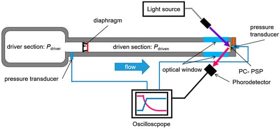 Figure 4 shows a schematic of the unsteady-state calibration setup, which determined the time response. The step change of pressure generated by a normal shock in a shock tube was used to determine the time response. A time delay of I from the step change of pressure was measured for the sensor. The driven section and driver section lengths were 1600 and 600 mm, respectively, with a cross-sectional area of 30 square mm. Dry air was used as a test gas at a reference temperature of 300 K. This shock tube had the driver and driven sections separated by a diaphragm. The diaphragm was burst by the pressure difference between the driver and driven sections, and a normal shock wave was propagated towards the PC-PSP in the driven section. The pressure difference produced by setting pressure equal to 3 kPa and 130 kPa in the driven and driver sections, respectively, produced a normal shock wave with a Mach number of 2.1 in the tube. A PC-PSP and pressure transducer (XCQ-062-50A, Kulite Semiconductor Products, Leonia, NJ, USA) were put on the end plate of the tube. An excitation light generated by a blue laser at 465 nm passed through one of the optical windows and illuminated the PC-PSP test sample. The sample emitted a luminescent intensity, I, and the photodetector measured it passing through the optical window on the other side of the tube. A photomultiplier tube (PMT) (H57730-04, PMT, Hamamatsu Photonics, Shizuoka, Japan) acquired its intensity, while a photodetector and a band-pass filter (620 ± 20 nm) put in front of the PMT cut off the unnecessary wavelengths. This detector was required to have a much faster time response compared to the unsteady PSP, which had a time response on the order of ten to one hundred microseconds, in order to determine the PC-PSP time response. It had a sufficient time response on the order of nanoseconds.