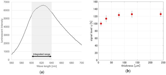 Figure 5a shows a representative luminescent spectrum obtained from PCPSPth01 under the reference conditions, which were 100 kPa and 300 K. The integrated range shown by the shaded area determined the luminescent intensity, I, for the given pressure and temperature. The signal level, η, for each pressure and temperature was determined from Equation (2). The signal level, η, related to the thickness is shown in Figure 5b. It can be seen that as the thickness increases, η approaches saturation. The change in η for the thickness over 80 μm was within the expected level of uncertainty. With the thickness over 80 μm, we could obtain an over 20% increase of η compared to η of 10 μm in thickness. This result tells us that, if we can spray PC-PSP with a thickness over 80 μm, the intensity variation related to the thickness is minimal. This is a good aspect for a PSP measurement, because a spatial variation in luminescent intensity can be reduced by spraying PC-PSP over 80 μm. Also, the signal level saturation implied that the supporting matrix limited the amount of the luminophore per volume of the base coat layer. Even though the PSP was dipped in the solvent for a longer time than investigated here, the dipping time effectiveness on the signal level of PSP samples might not be significant.