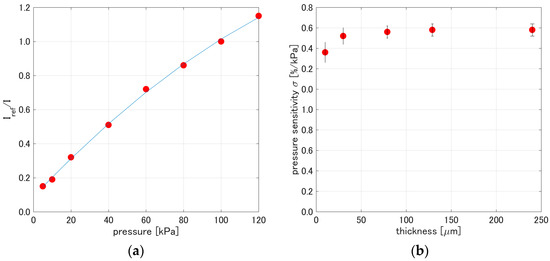 (a) Pressure calibration of PCPSPth01; (b) Pressure sensitivity related to PC-PSP thickness.