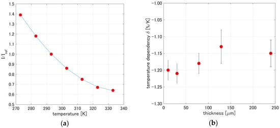 Figure 7a shows a representative temperature calibration obtained from PCPSPth01. A second-order polynomial could describe the temperature calibration. Figure 7b shows the temperature dependency, δ, related to the thickness. The temperature dependency, δ, for each thickness was determined by Equation (7). The δ decreased from −1.2%/K to −1.15%/K. The change in δ was within 5%, which was within the expected level of uncertainty. The results show that δ related to the thickness can be considered a less influential factor.