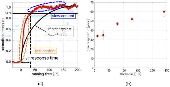 Figure 8a shows a representative result of the step response obtained from PCPSPth01. The time response, τ, was defined as a time delay from a step change of pressure. If we use the first-order system shown in the figure, it was not appropriate to describe the response. It can be shown by fast and slow contents in the step response. Instead of applying the first-order system, we determined the time response, τ, as a time delay approaching the 90% change to the normalized pressure, Pnorm [22].