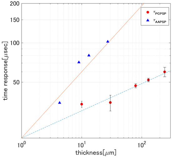 Figure 9 overlaid the present results and the AA-PSP time response related to its thickness. The AA-PSP time response was obtained from Sakaue and Sullivan [21]. Horizontal and vertical axes are shown as a logarithmic scale to linearly fit Equation (9). Based on Equation (9), the time response of PC-PSP was proportional to h0.208, while that of AA-PSP was proportional to h0.505. Even though there was a thickness dependency on τ, the change in τ for PC-PSP was smaller than that of AA-PSP.