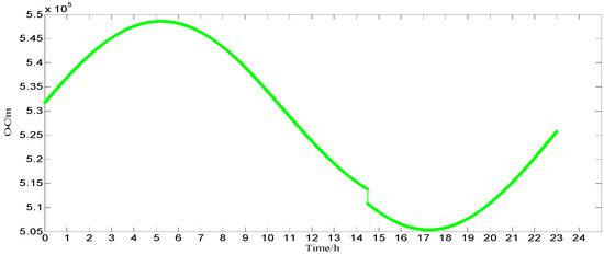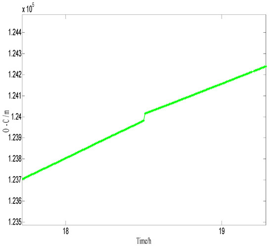- Testing and analysis in GEO-03(PRN3). The testing results of methods one and two are shown in Figure 8 (X-axis represents time, unit is hours; Y-axis represents value calculated by Equation (3), unit is meters); from 5 January 2015 9:00 to 5 January 2015 14:00, the health flag of the broadcast ephemeris showed that GEO-03 is in an unhealthy state; on 5 January 2015, among the products of precise orbits, GFZ did not calculate the coordinates of GEO-03; at station WUH1, the O-C values of GEO-03 are shown in Figure 9 (X-axis represents time, unit is hours; Y-axis represents that station-satellite distance minus observed distance of L3, unit is meters);