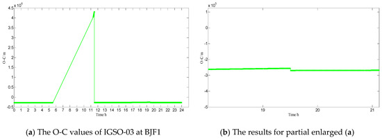 From Figure 10, it can be seen that anomalies do not affect the detection of maneuvering. From the results in Table 3, it can be seen that on 9th January 2015, at 19:00–20:00, both methods detect that IGSO-03 maneuvering may occur: the health flag of broadcast ephemeris shows that IGSO-03 is in an unhealthy state, while in the previous five hours and the later one hour, the health flag shows that IGSO-03 is also in an unhealthy state; GFZ may think that IGSO-03 is in an unhealthy state; and, there is a jump in the O-C value at BJF1, which may represent that IGSO-03 is in an unhealthy state.