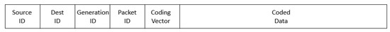 Here the ’Source ID’ is the ID of the transmitting node, the ’Dest ID’ is the ID of the receiving node, and the ’Generation ID’ is the identifier of a generation. The source node categories all the source packets into some groups and each group includes h source packets. Such a group is called one generation. In each generation, the h packets are assigned with a packet ID ranging from 1 to h respectively. In addition, the source sends one generation in each transmission. The ’Coding Vector’ is the vector of combination coefficients of the coded packet.