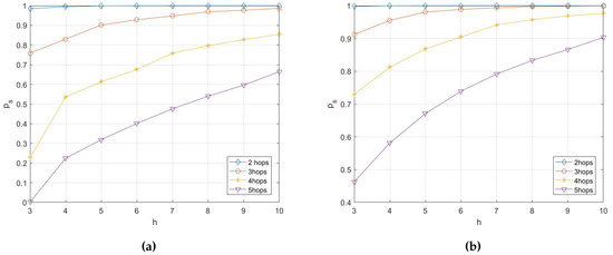 It can be concluded from Figure 7 that with the increase of multicast capacity h, the probability of transmission being secure increases slightly. However, With the increase of number of hops k, the probability of transmission being secure decreases rapidly. If the desired probability of transmission being secure is , the number of hops needs to be limited with .