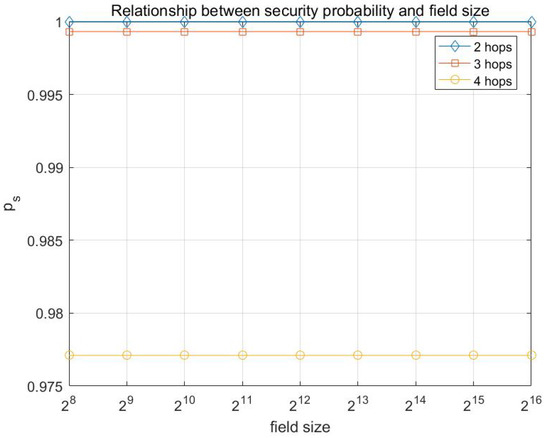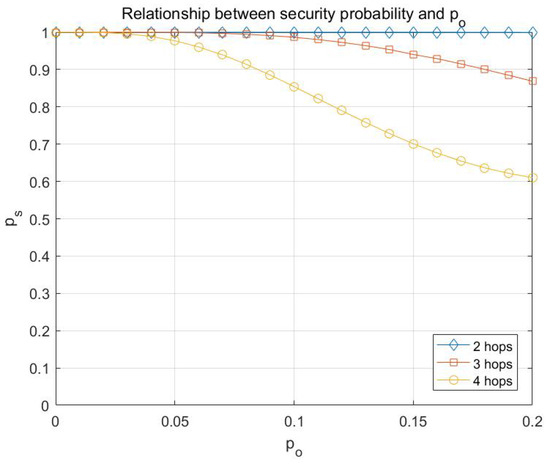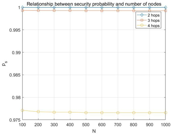 From Figure 8, it can be concluded that the attacking capability of adversary has a relatively significant impact on the probability of transmission being secure, and the larger the number of hops is, the greater the impact is.