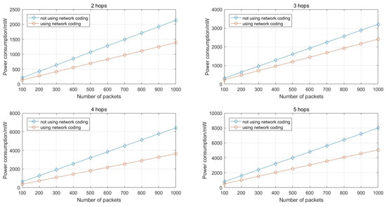 As Figure 11 shows, it is clear that the network coding based scheme has a better energy efficiency and the more packets transmitted, the more energy consumption can be reduced.