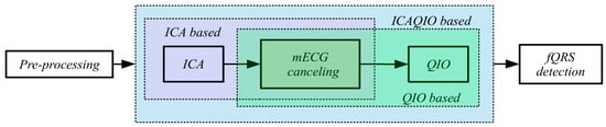 Block-diagram of the three methods compared in this study: ICAQIO-based, QIO-based and ICA-based. The pre-processing and the fQRS detection steps are common to the three algorithms.