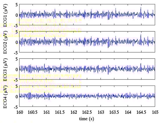 Pre-processing aimed at removing the most undesired noisy components before separating mECG and fECG. The same pre-processing steps were applied for all the three methods tested in these studies and include: impulsive artefacts canceling, baseline wandering removal and power-line interference canceling. A detailed description of the procedures used in this study can be found in our previous papers [23,34]. Figure 2 shows a 5 s interval of the four selected channels of the FECGSYNDB after pre-processing.