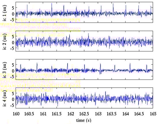 Several algorithms have been implemented, which realize ICA, including second order blind identification (SOBI) [41], joint approximate diagonalization (JADE) [42] and FastICA [43]. In our approach, the FastICA [43] with deflationary orthogonalization was selected as ICA algorithm as it gave the most reliable results respect to the other tested algorithms (SOBI and JADE) [23]. The ICA algorithm was applied using the all registration length as block size. The hyperbolic cosine was the preferred contrast function; in the few cases when convergence failed, kurtosis was automatically selected. Figure 3 shows the results of ICA applied to the pre-processed signals shown in Figure 2.