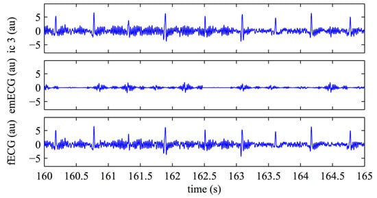 Application of maternal ECG canceling. Top: ECG after the application of ICA (ic3 in Figure 2); middle: estimated mECG (emECG) obtained by SVD; bottom: residual fECG signal resulting from by the two previous signals subtraction. Intensity values are expressed in arbitrary units (au).
