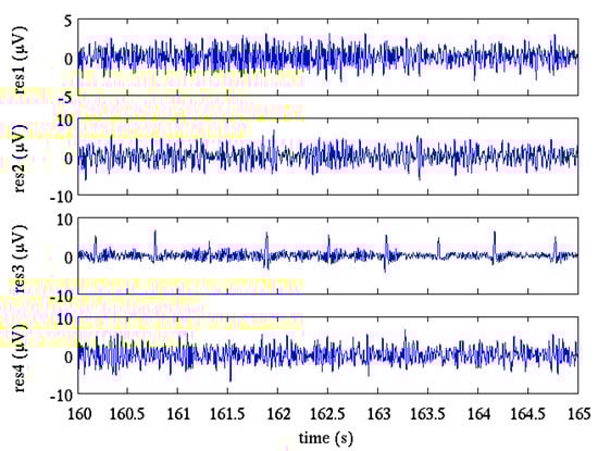 Residual signals (res1, res2, res3, res4) obtained after maternal ECG canceling from the four selected channels.