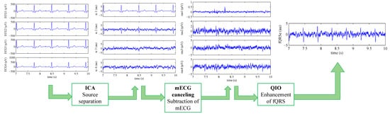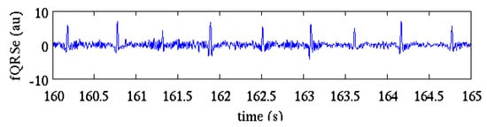 Figure 6 shows the fQRS-enhanced signal extracted from the residual signals by the application of the fQI optimization algorithm. It can be observed how the application of the fQI optimization step improves the estimation of fECG compared to that obtained after ICA and canceling (Figure 4, bottom).