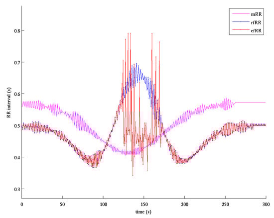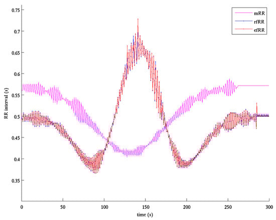 Fetal RR series estimation after the application of the ICAQIO-based method. mRR: maternal RR series obtained by the reference maternal channels (magenta); rfRR: reference fetal RR series (blue); efRR: estimated (red) fetal RR series obtained by the application of the two-pass fetal QRS detection procedure.