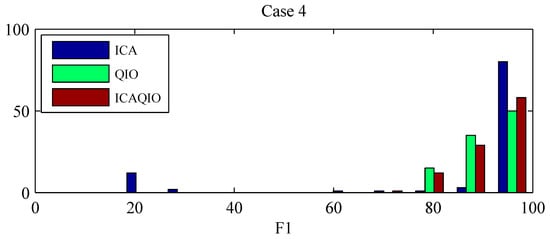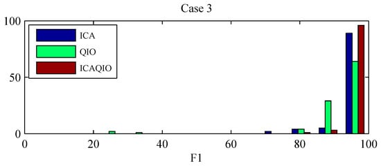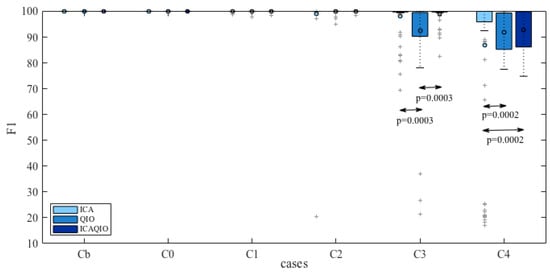 Comparing paired differences within each case between the performance of the ICAQIO-based, the QIO-based and the ICA-based algorithms, we obtained that in case 3 the F1 gross value of the ICAQIO-based method was significantly higher than that of the QIO-based method (p = 0.0003) and the F1 gross value of ICA-based method was significantly higher than that of QIO-based method (p = 0.0003). No significant differences between the ICAQIO-based method and the ICA-based method were obtained in case 3. In case 4 the F1 gross value of the ICAQIO-based method was significantly higher than that of the ICA-based method (p = 0.0002) and the F1 gross value of QIO-based method was significantly higher than that of ICA-based method (p = 0.0002). No significant differences between the ICAQIO-based method and the QIO-based method were obtained in case 4. No significant differences among the three methods were obtained in the other cases. Figure 10 shows the F1 of the three methods for all the cases.