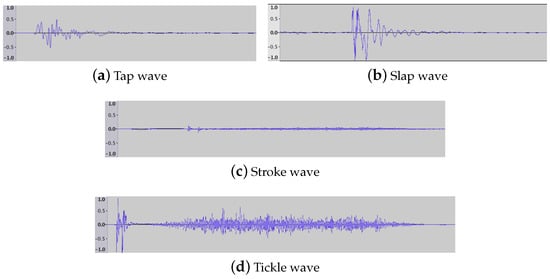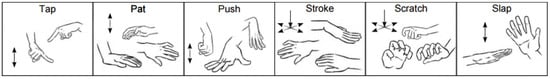 As reviewed in Section 2, there are works in the literature proposing different sets of gestures for HRI. In this regard, Johanan et al. [] presented a touch set of 30 items extracted from the social psychology and human–animal interaction literature. Similarly, Altun et al. [] proposed a set of 26 gestures. However, Silvera et al. proposed reducing those sets to 6 gestures [], discarding some gestures since their aim was to achieve atomic expressions easy to distinguish.