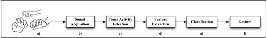 Murray-Smith [] introduced Stane, an electronic device controlled by touch interaction based on microphones to operate a music player. For that purpose, Stane uses a combination of capacitive and inertial sensors, as well as contact microphones. More specifically, Stane can recognize the following touches: stroke, scratch, rub, and tap. The authors argued that the use of piezo-microphones, or contact microphones, is perfectly suitable to collect the vibrations generated for these type of contacts on solid surfaces. For the classification task, they used an artificial neural network trained with 26,880 examples and validated with 11,520 unseen instances (test set). Their experimental results showed an accuracy rate of about using the test set and these four types of contacts. However, that paper did not include information about the number of users participating in the evaluation.