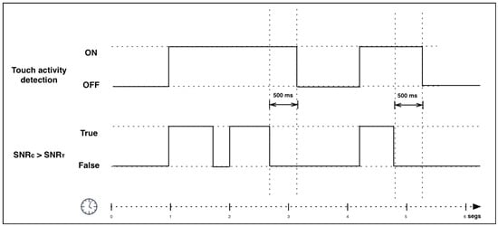 Using these equations, our system is able to detect the occurrence of a gesture, , without being affected by external noise. Thus, the system detects touch activity when the current SNR is higher than the threshold, as shown in Equation (3). In order to achieve a more stable output, a 500 ms extra acquisition time begins when drops below so that touch gestures composed of more than one touch instance (e.g., tickles) are grouped together (see Figure 3). If the extra time expires without detecting touch activity, then the touch is considered finished.