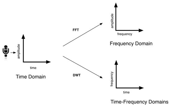 Once the touch activity has been determined, it is necessary to analyse the rest of the features of the sound detected (Take into account that RMS and SNR have already been computed to determine when the contact begins and ends). In this feature extraction process we have used a software component that analyses the acoustic signal in three domains: time, frequency, and time-frequency. This software operates in real time, analysing a series of features extracted from the audio input signal. The ones related to the time domain are directly obtained from the sampled analog signal acquired from the microphone. In the case of features belonging to the frequency domain, the Fast Fourier Transform (FFT) is applied to the time-domain signal []. Finally, features related to the time-frequency domain signal are obtained applying the Discrete Haar Wavelet Transform (DWT) [] (see Figure 4).